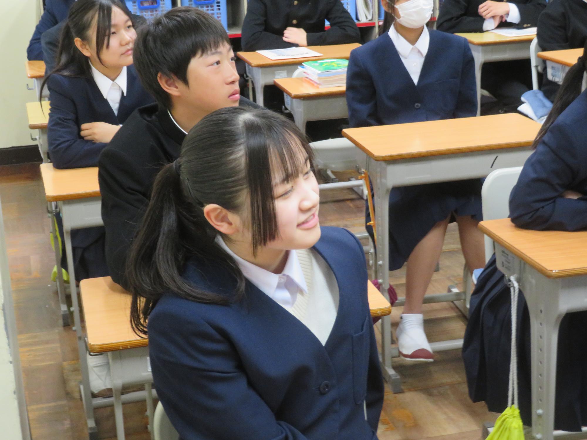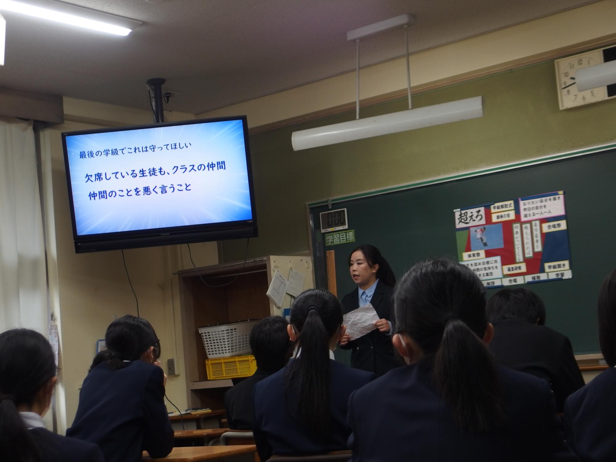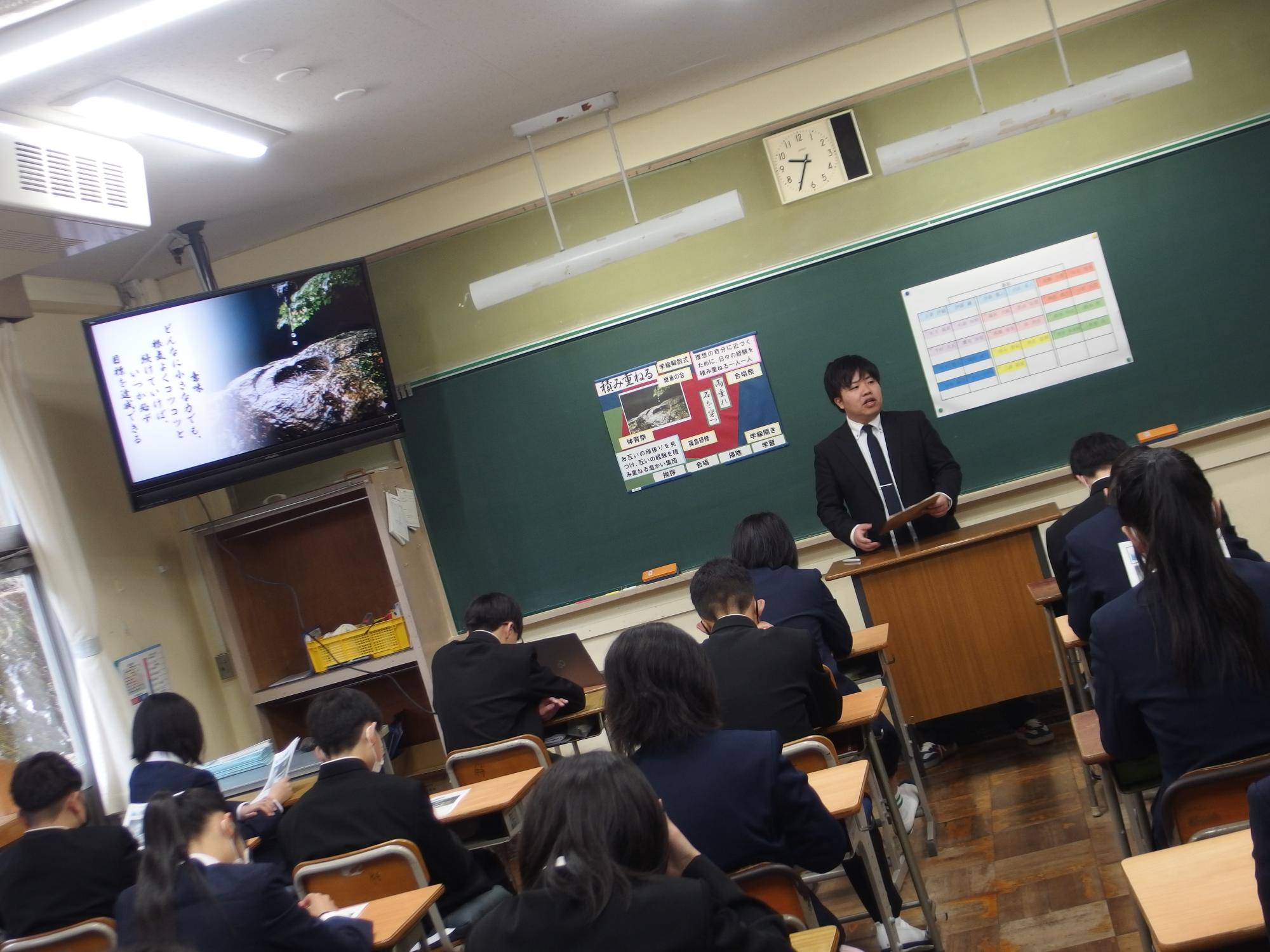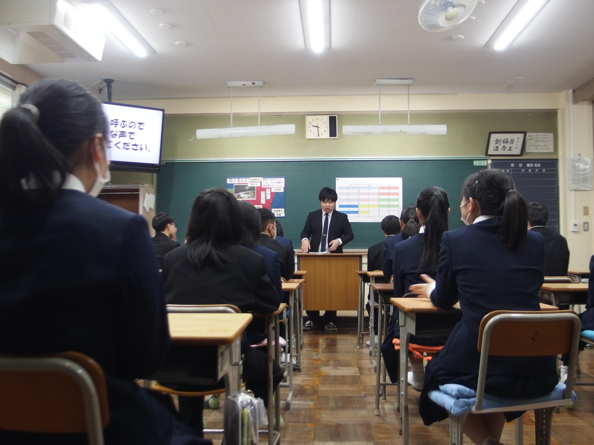 新たなクラスでの一歩(学級びらき) 更新日:2026年04月07日 新しいクラスでの学校生活のスタートです。始業式では生徒会の丸山副会長が「憧れられる先輩になるために、するとよいことを判断し姿で示していきましょう。」と全校によびかけました。その後の学級びらきは、担任の先生との初顔合わせです。担任の先生の「こんなクラスにしたい!」という願いを真剣に聞く姿から、「新たなクラスで頑張るぞ」という願いがこもった最初の一歩を感じました。新たなクラスの物語がよりよいものになることを強く期待しています。