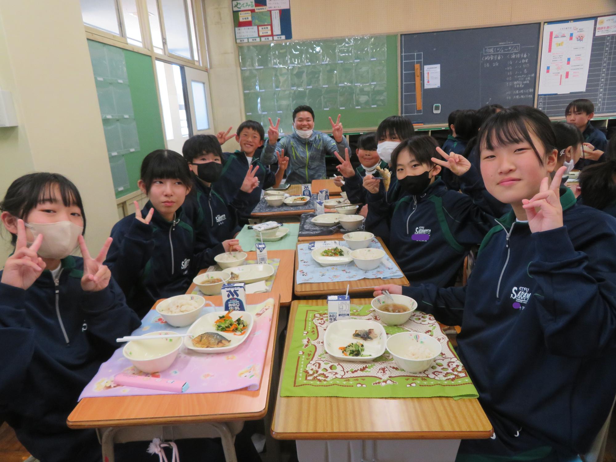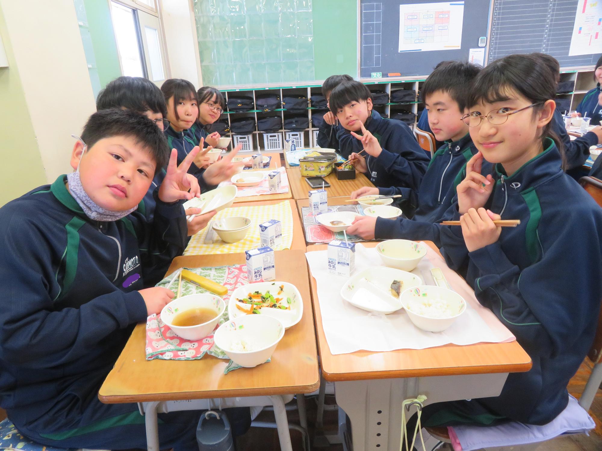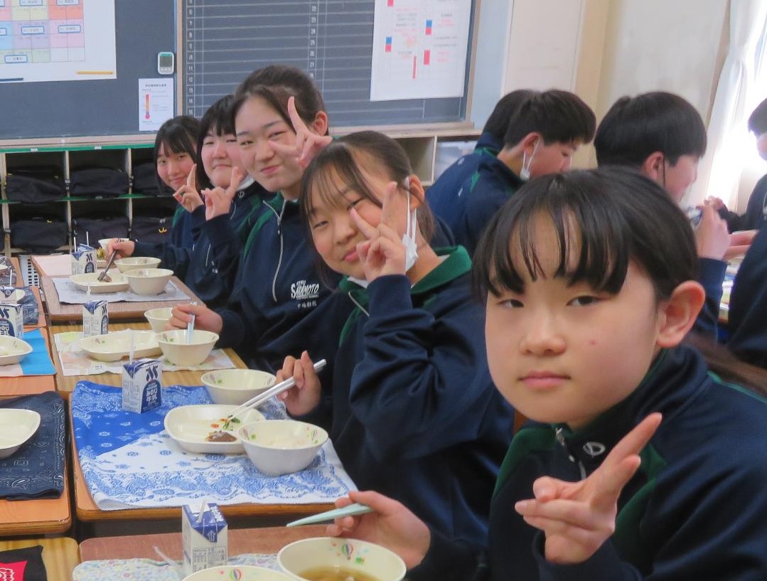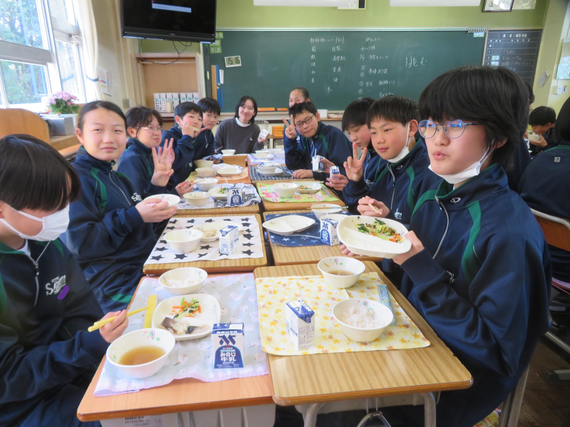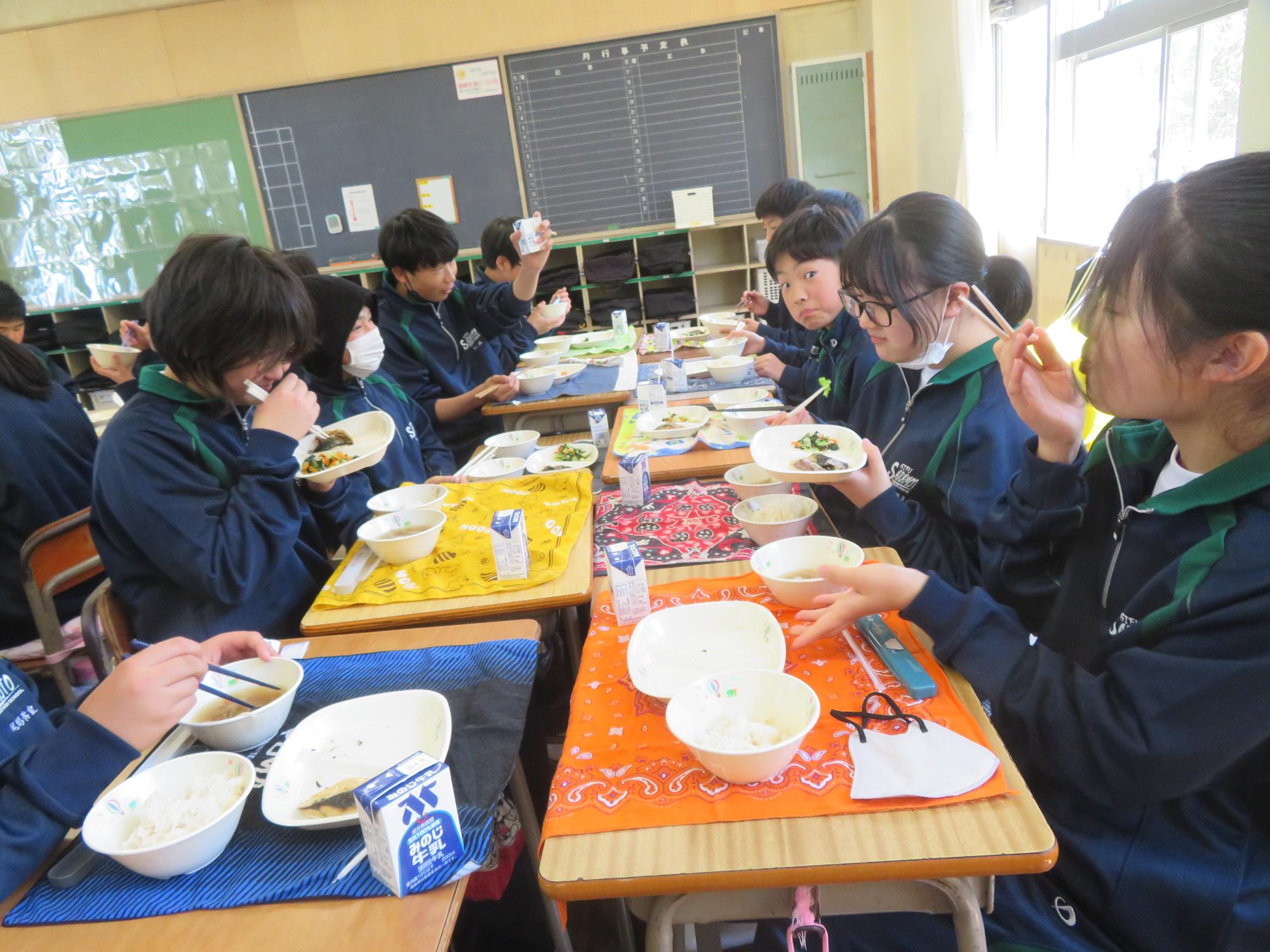 中学校での初めての給食 更新日:2026年04月10日 1年生は中学校での初めての給食です。小学校の時よりも少し量が多いようですが、どの生徒ももりもり食べていました。グループ隊形で食べる中学校スタイルに新鮮さを味わいながら、笑顔で給食時間を過ごしていました。たくさん栄養をとって中学校で生活していくエネルギーを蓄えていくことを願っています。