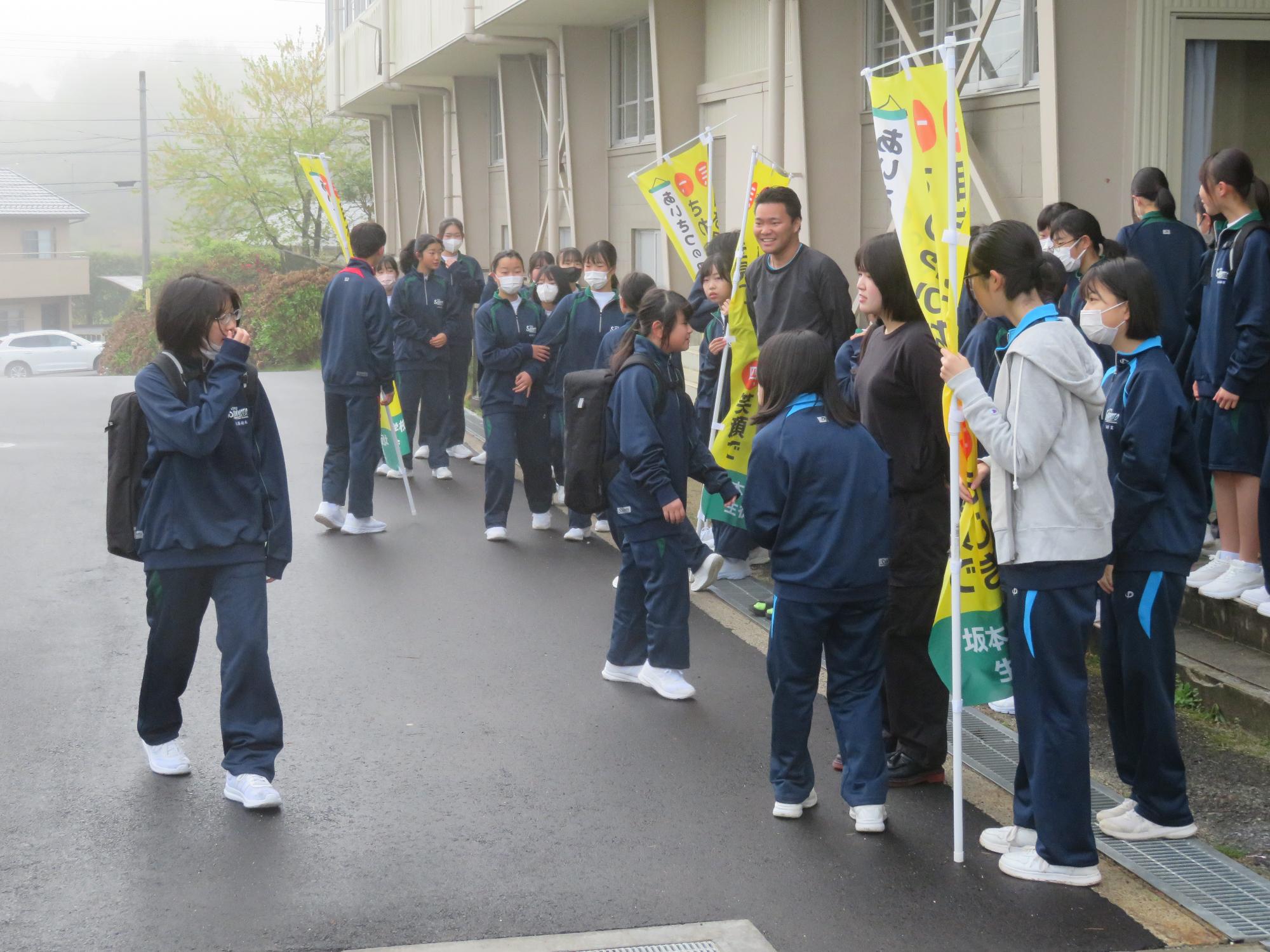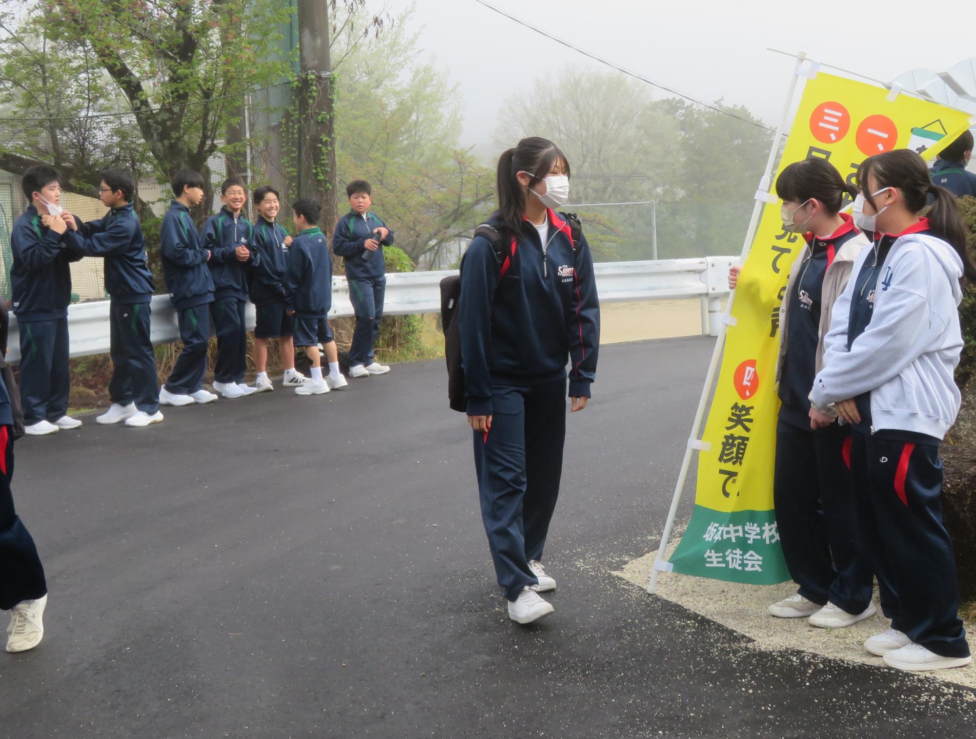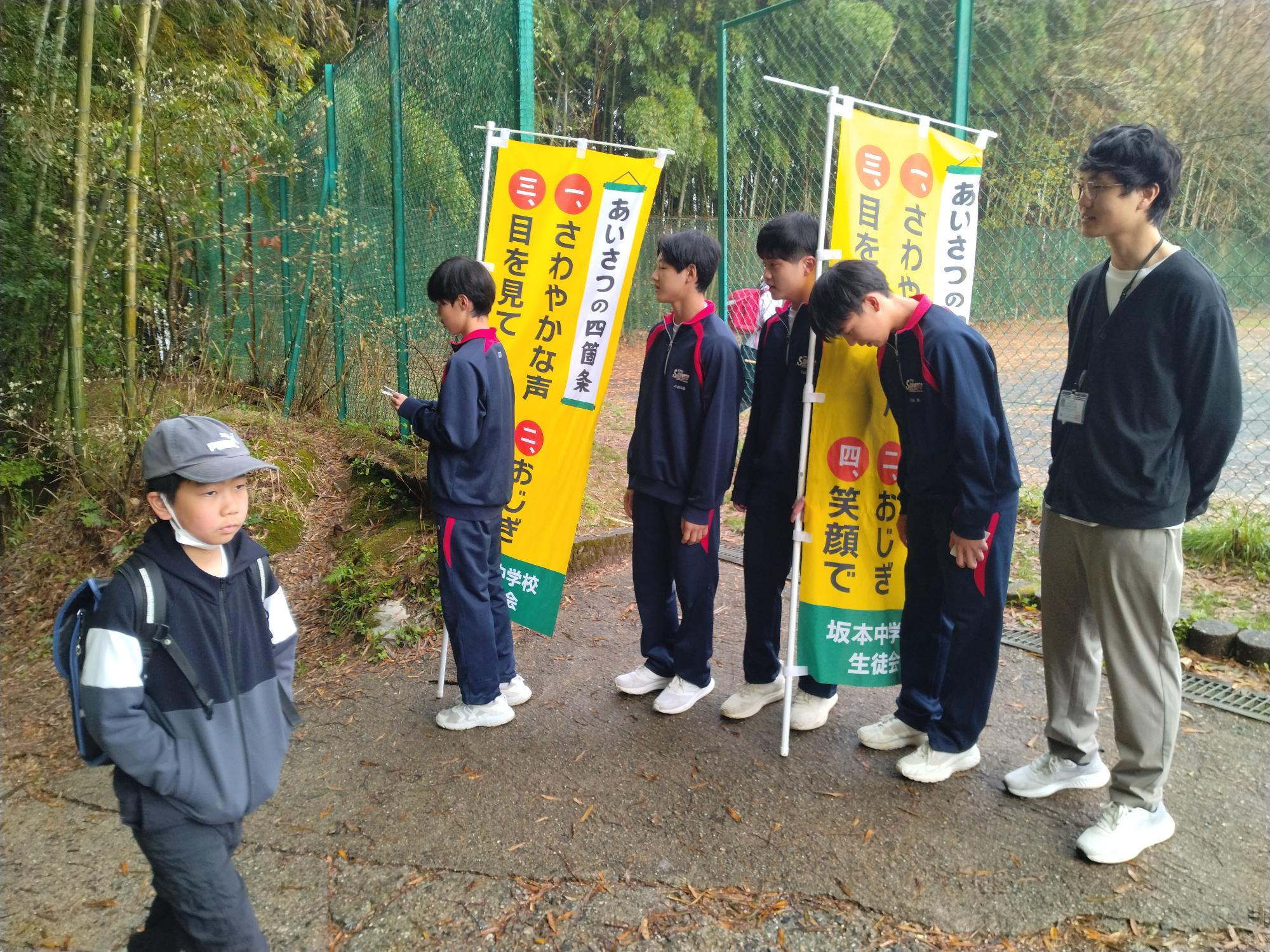120名を超える挨拶の声 更新日:2026年04月19日 生徒会がウェルカム挨拶週間と位置付けて挨拶を呼びかけ、今日で4日目。生徒会の挨拶を呼びける輪に、ボランティアで他の生徒が加わり続け、今日は120名を超える生徒が加わりました。ちょうど地域の方も挨拶を啓発する日で来校されましたが、「坂中生のエネルギーはすごいですね。」と称賛の声をいただきました。坂中4本柱の挨拶を本物の誇りあるものにする坂中生の今後のBRUSH UPを期待しています。