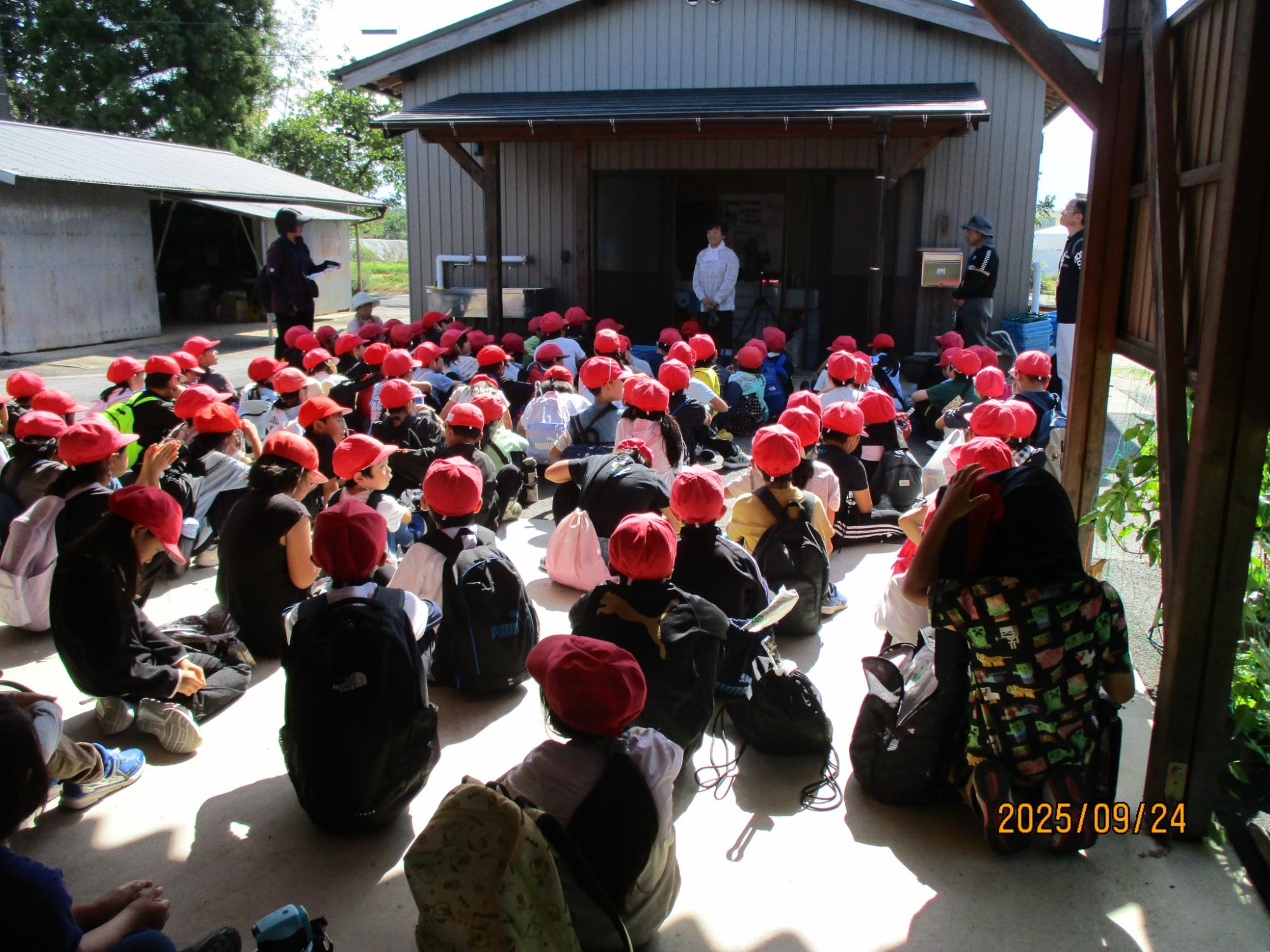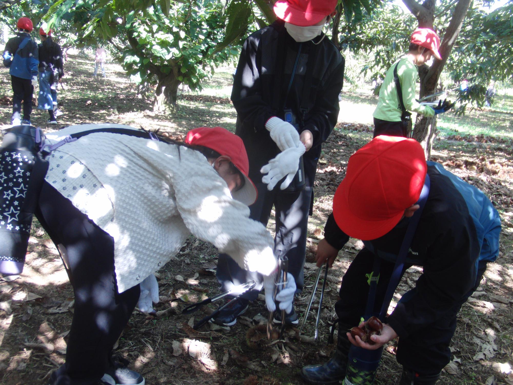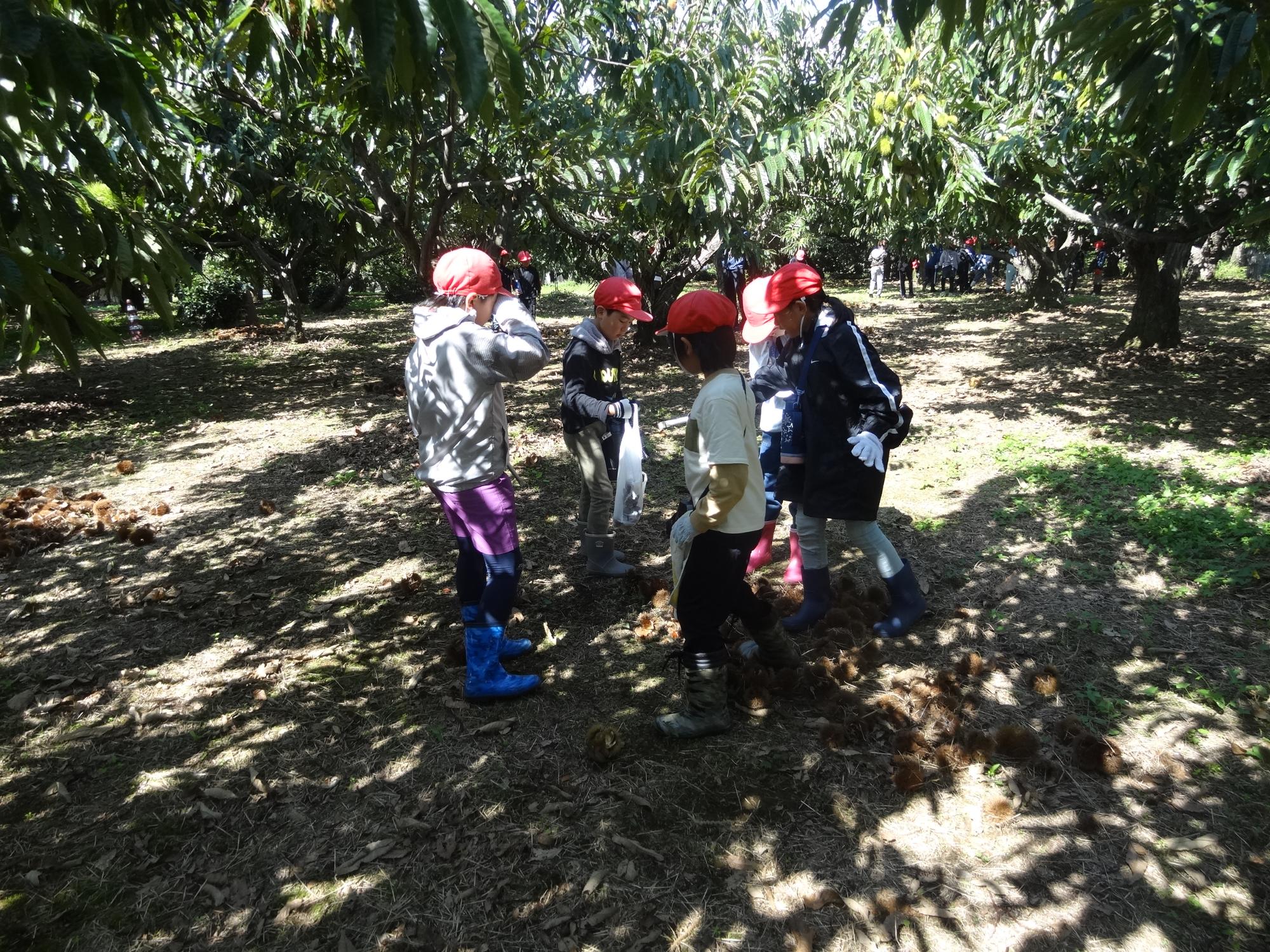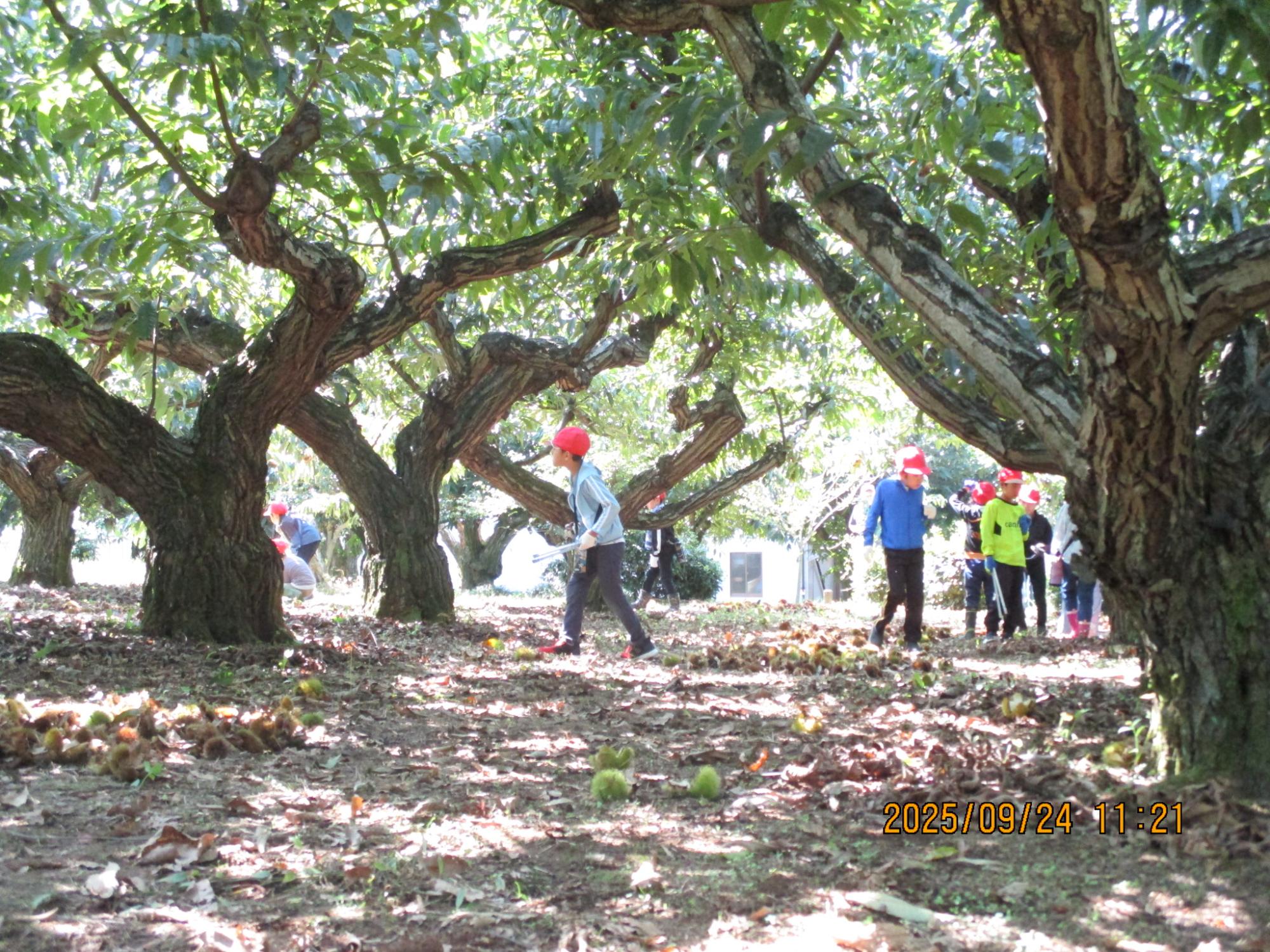 3年生栗畑見学 更新日:2025年09月25日 9月24日、3年生が栗畑見学に出かけました。今回も土屋さんの栗畑で、立派に育った栗をトングを使って拾ったり、足で踏んで、いがを外したりして楽しそうに活動していました。春に見学した栗畑と比べることや生産することの学習につながりました。見守りボランティアの皆さんにもお世話になりありがとうございました。