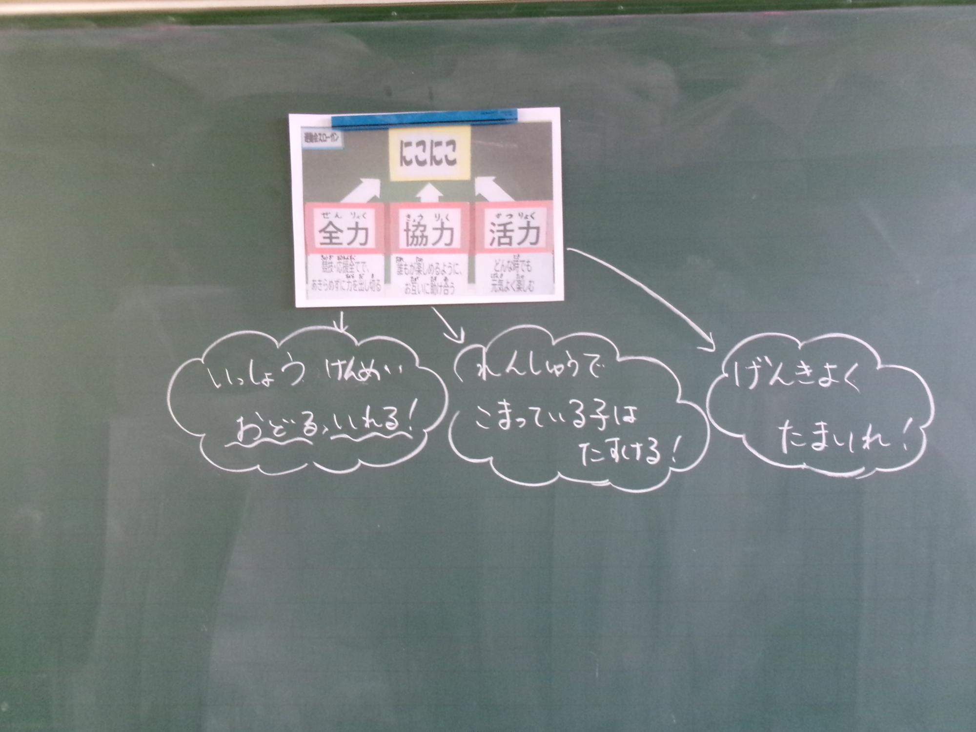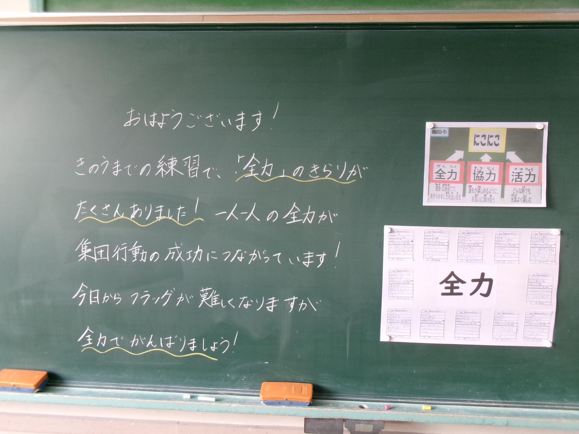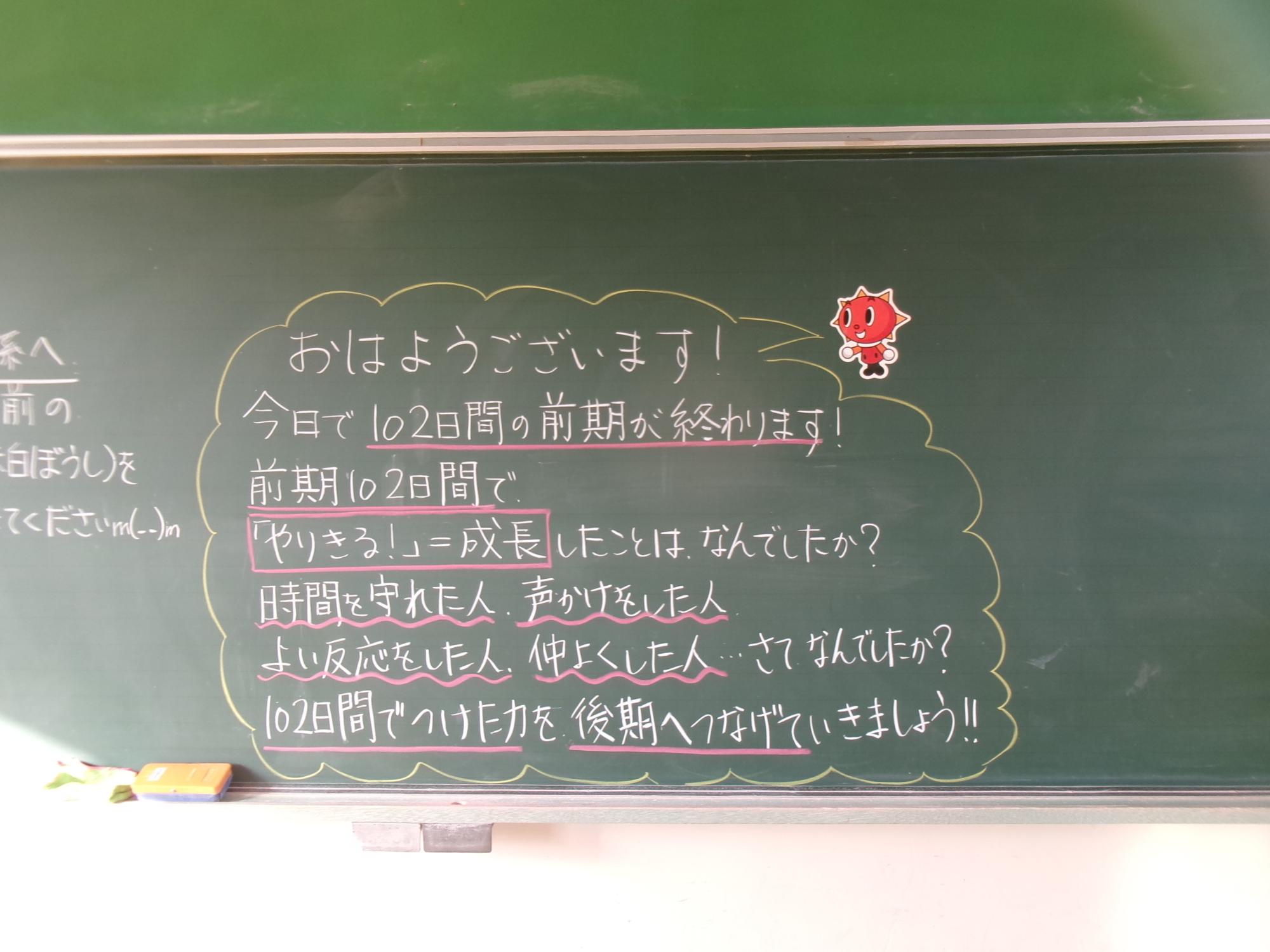 にこにこ~全力・協力・活力 更新日:2025年10月10日 今日は前期終業式です。朝の黒板通信には「運動会に向けて」や「今日の姿への期待」という担任からのメッセージが書かれています。前期を振り返って自分なりに頑張れたことを家でもほめてあげてください。