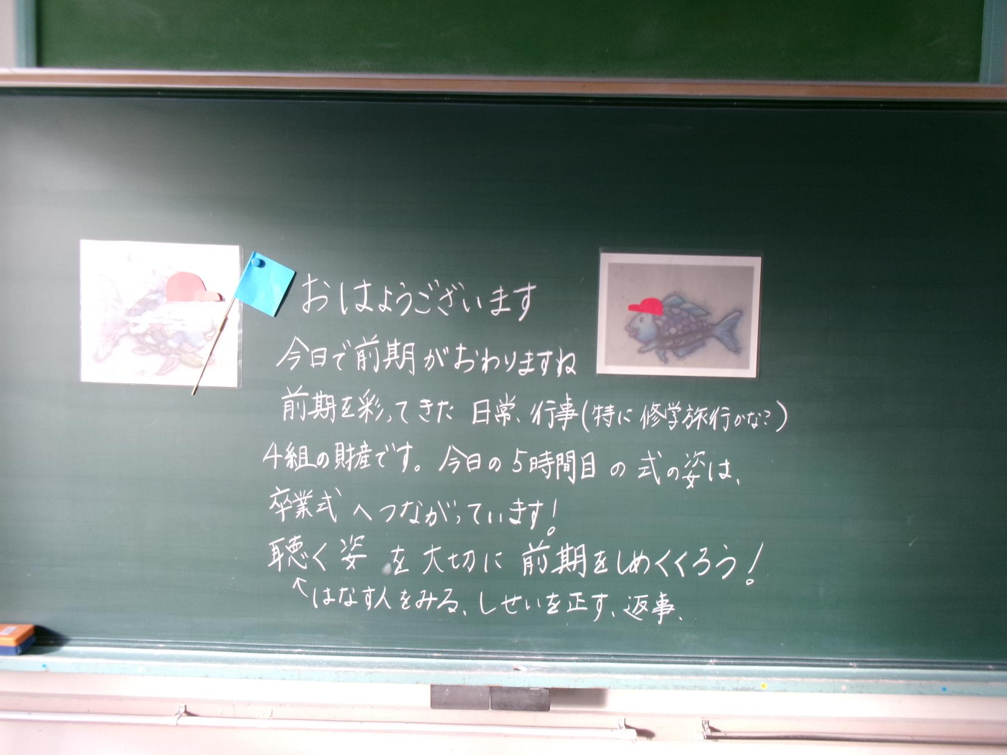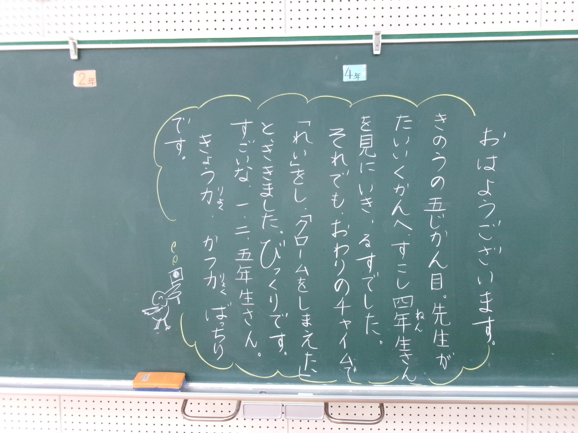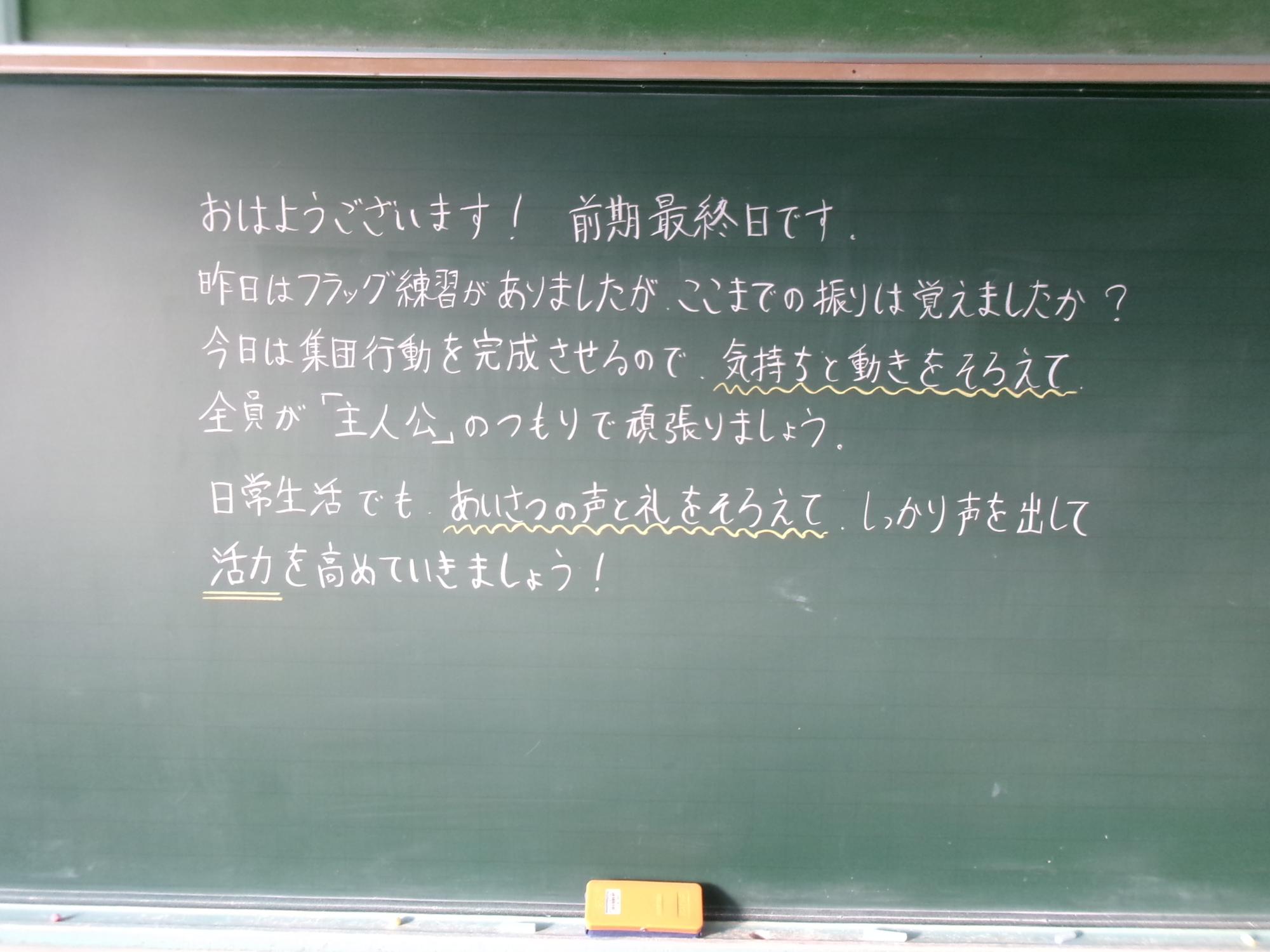 にこにこ~全力・協力・活力 更新日:2025年10月10日 今日は前期終業式です。朝の黒板通信には「運動会に向けて」や「今日の姿への期待」という担任からのメッセージが書かれています。前期を振り返って自分なりに頑張れたことを家でもほめてあげてください。