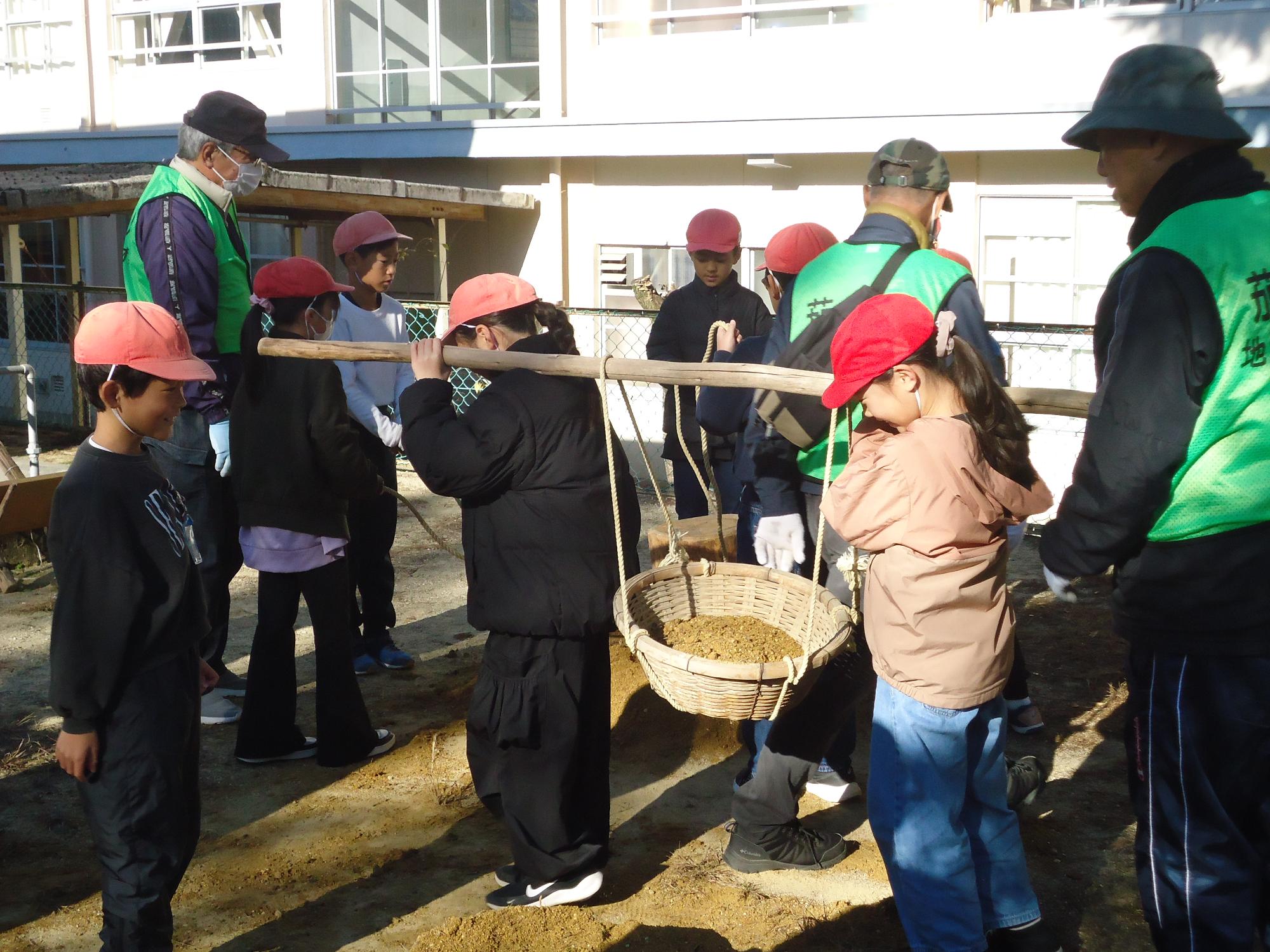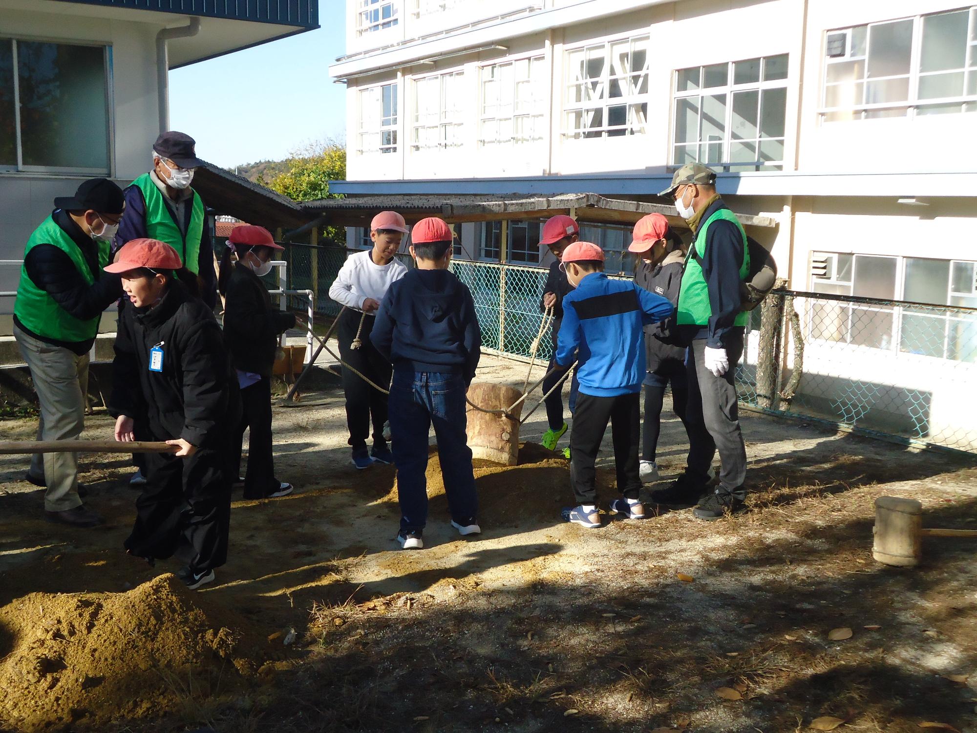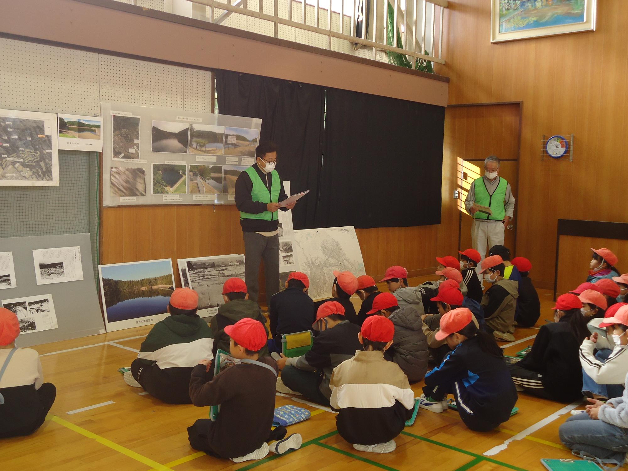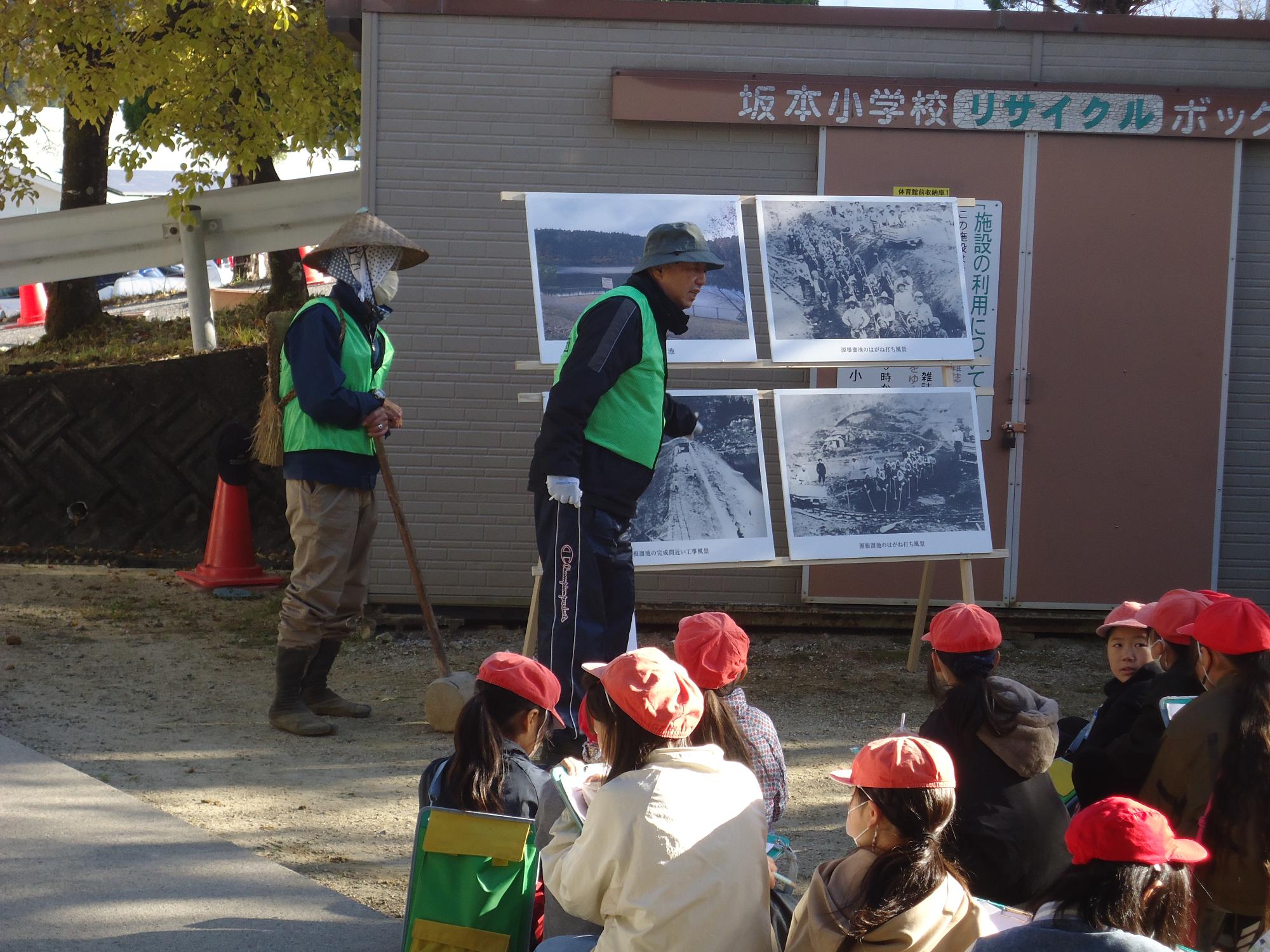 治山・治水・源根学習 更新日:2025年11月21日 11月20日、4年生の総合的な学習の時間で坂本地区の治山・治水、源根のため池について学びました。源根のため池の位置や歴史、治山や治水の意味と意義、坂本地区の様子について説明していただきました。外では、源根のため池を作った当時の様子について学ぶと同時に、そのときに使用していた道具を実際に使って、土を運んだり地面を固めたりする体験をしました。茄子川財団の皆様、恵那農林事務所の皆様、ありがとうございました。