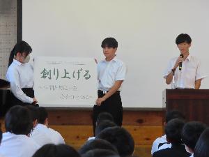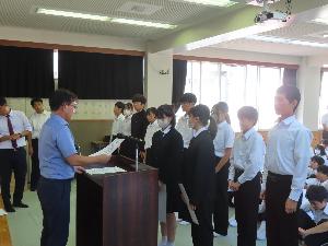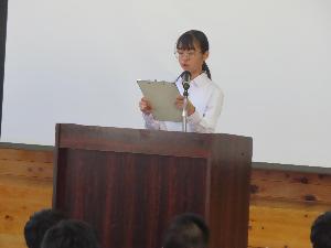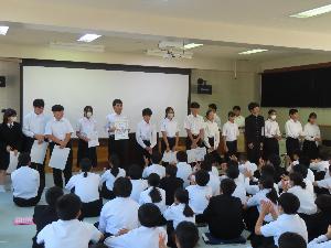 前期終業式 更新日:2025年10月10日 10月10日に前期終業式を行いました。1年生の代表生徒は、前期を振り返って自分はどんな成長ができたのか、なぜ成長ができたのかを、堂々と発表していました。学校長からは、「節目を大切にすること」「居心地の良い学校作りのために一人一人ができたことがたくさんあった」という話がありました。また、夏休みから活躍してきたたくさんの生徒の表彰がありました。最後は、生徒会執行部から、合唱祭のスローガン発表があり、後期への展望をもつことができました。