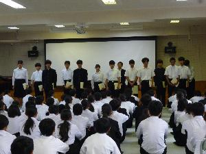 後期始業式を行いました 更新日:2025年10月14日 10月14日に後期始業式を行いました。校長からは、「思考は言葉となり、言葉は行動となり、行動は習慣となり、習慣は性格となり、性格は運命となる」という言葉を引用し、「考え方を変えるだけで人生が変えることができる」という話がありました。また、後期の生徒会執行部と委員長の認証式を行いました。後期の生徒会活動が楽しみです。