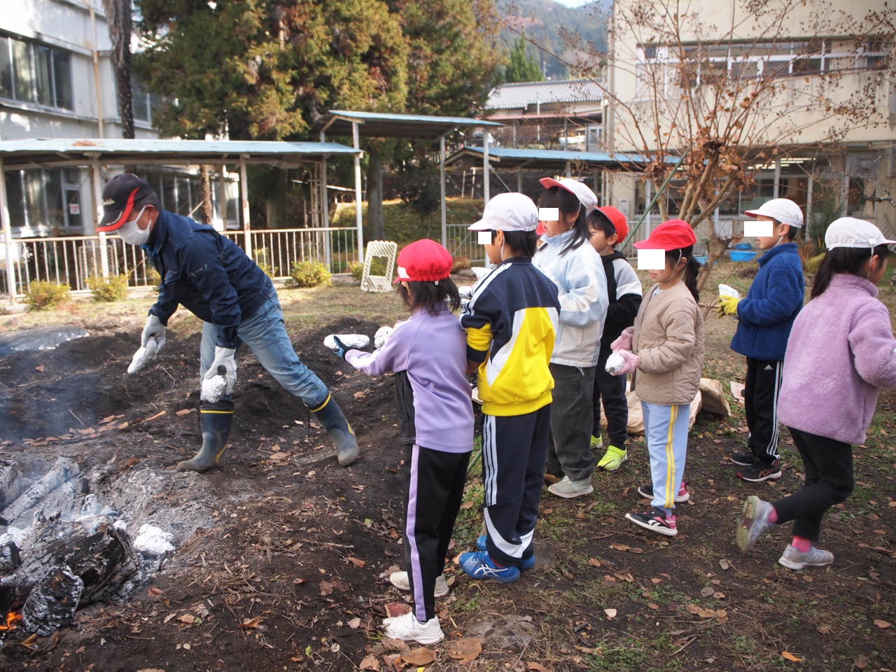 1・2年生が生活科の時間に、畑で育ててきたサツマイモを使って焼きいも大会を行いました。