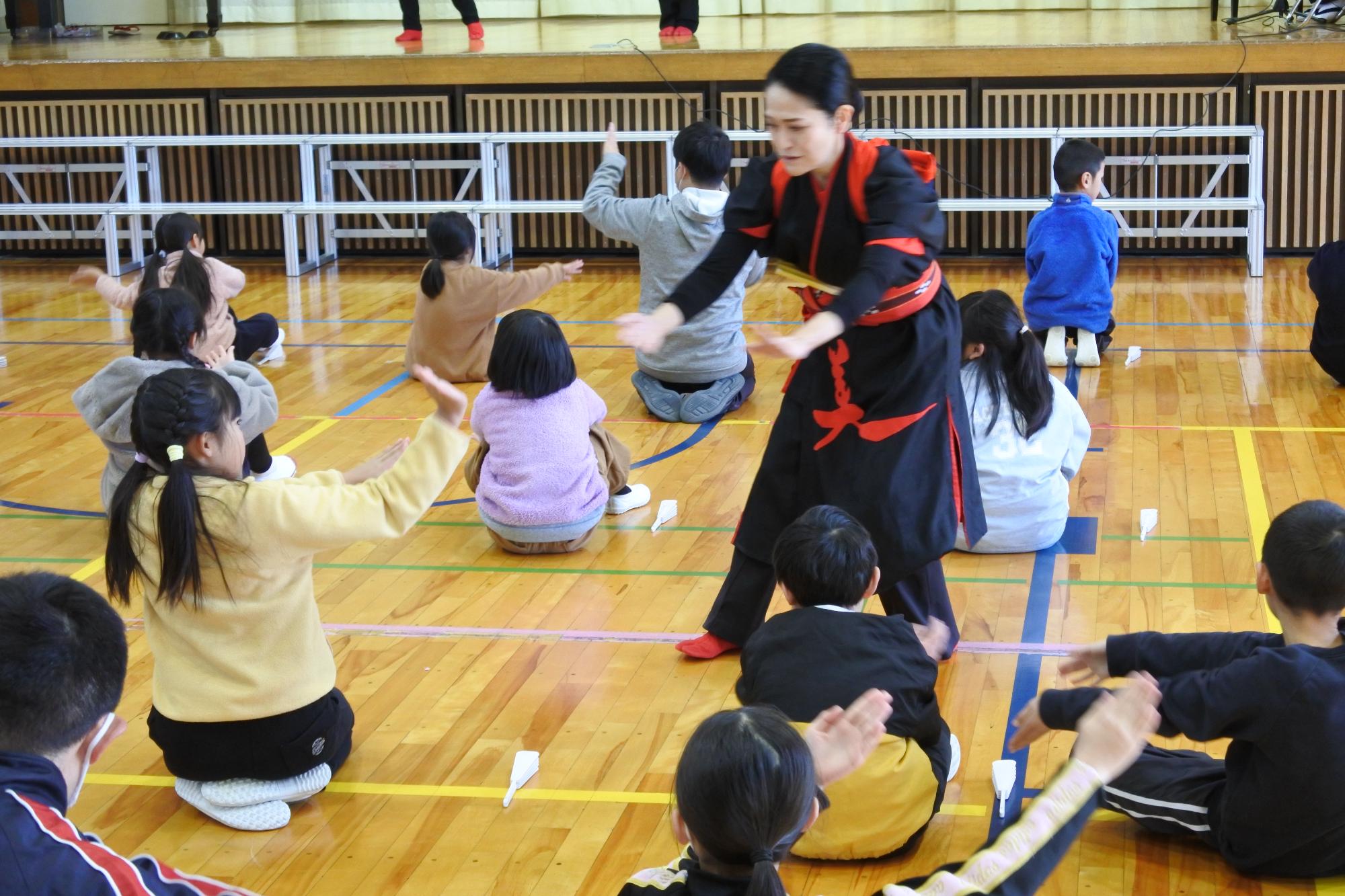 今日はその前段階として、舞踏家の皆様にご来校いただき、子どもたちに琉球舞踊を直接ご指導いただきました。琉球舞踊ならではの音楽や、ゆったりとしながらも特徴のある動きに、子どもたちは興味と意欲をもって取り組み、限られた時間の中でも上手に踊れるようになりました。活動の最後には、当日の公演を想定したリハーサルとして、実際の舞台前に立ち、舞踏家の皆様と子どもたちが一緒に立ち位置や踊りの流れを確認しました。その場に立つ子どもたちからは、すでに本番さながらの迫力が感じられました。当日は、さらに多くの舞踏家の皆様が出演され、本格的な衣装も加わります。子どもたちと舞踏家がともにつくり上げる、迫力ある琉球舞踊の舞台が今から楽しみです。